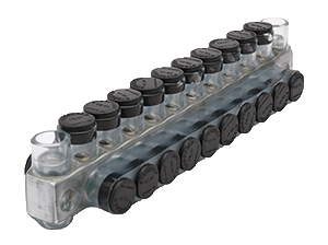 Aluminum Clear Pre-Insulated Mountable Power Bar - Ten Ports with Double Sided Conductor Entry 14 AWG - 2/0 AWG